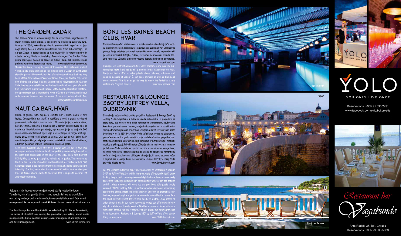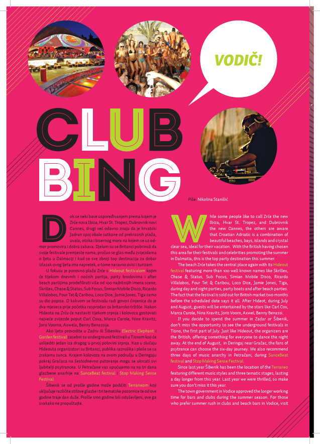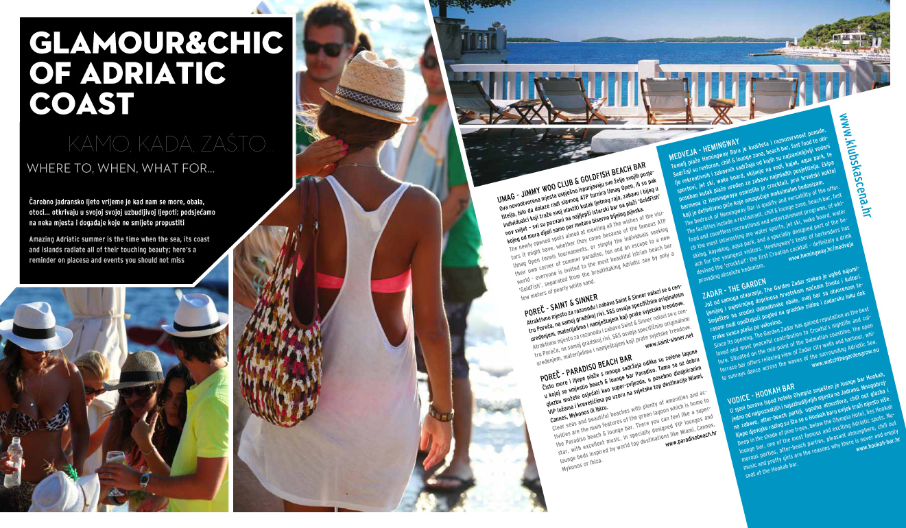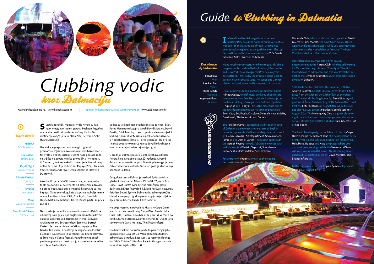 Osim za Klubsku scenu naš team piše kreativne članke o ljetnom clubbingu za vodeće turističke magazine poput Hot Spots Dalmatia, Yachts, Kongresni turizam, Time Out Croatia, ali i druge..
