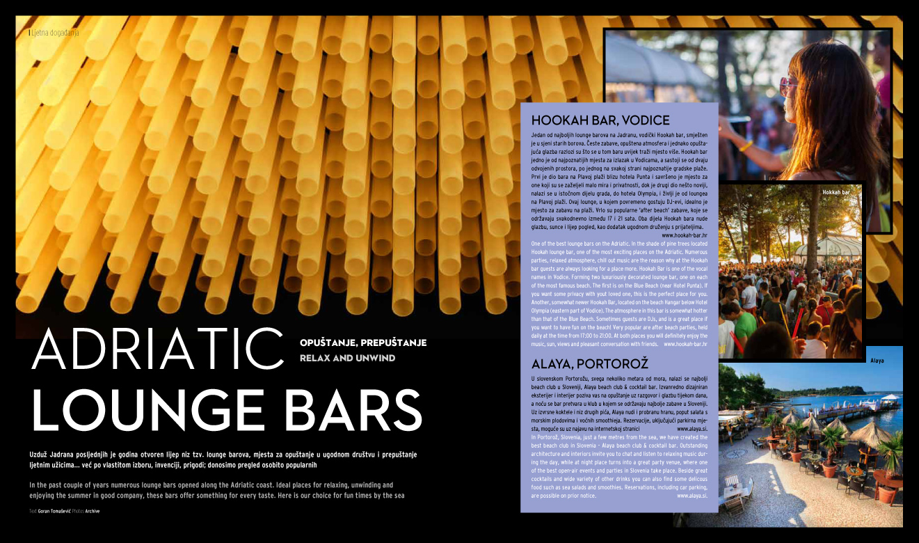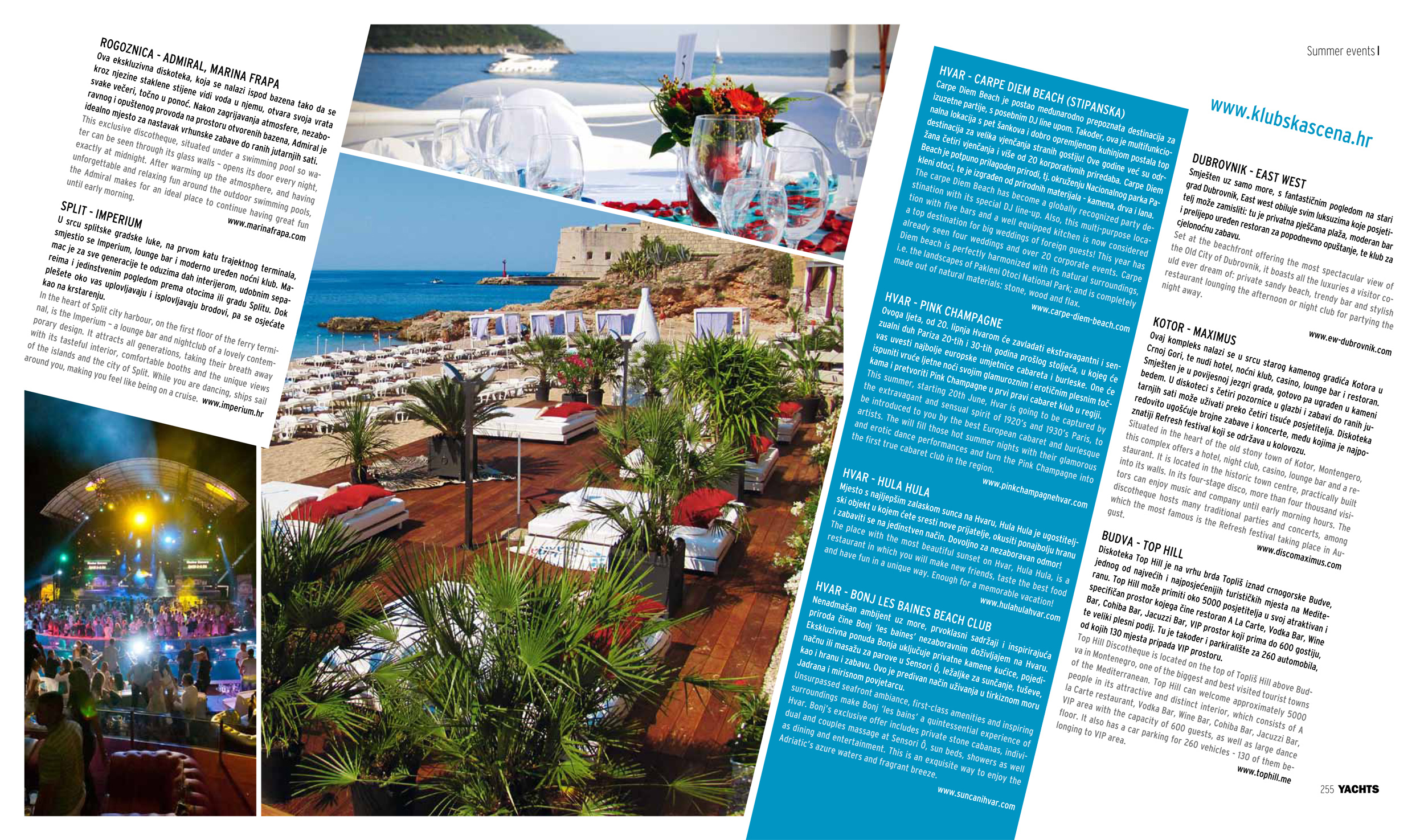 Osim za Klubsku scenu naš team piše kreativne članke o ljetnom clubbingu za vodeće turističke magazine poput Hot Spots Dalmatia, Yachts, Kongresni turizam, Time Out Croatia, ali i druge..
